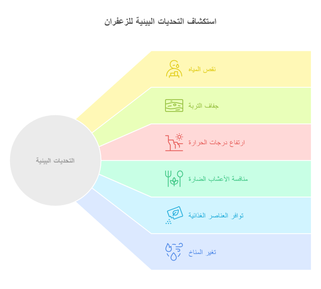 - نقص المياه: عدم توافر كميات كافية من المياه يؤثر على نمو الزعفران.