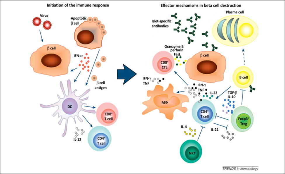 على مدار مسار المرض، تهاجم خلايا المناعة التي تتسلل إلى البنكرياس الخلايا المنتجة للأنسولين، مما يحفز ويعجل بظهور داء السكري من النوع الأول من خلال تقديم مستضدات الجزر للجهاز المناعي بواسطة جزيئات HLA من الفئة الأولى، مما يخلق بيئة التهابية تتميز بالتهاب البنكرياس (Bloem وRoep، 2017).