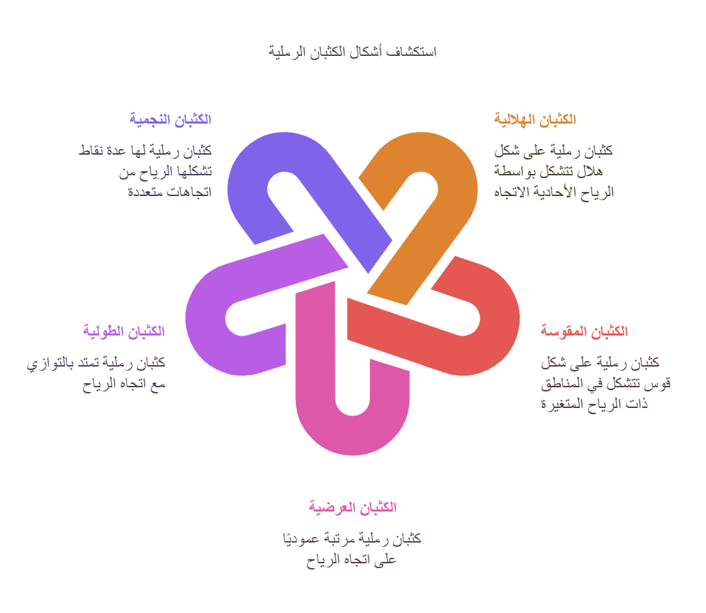 - تربة سهلة التفتت وجافة: تساهم التربة الجافة في تسهيل حركة الرمال بفعل الرياح، مما يؤدي إلى تراكمها في مناطق معينة.