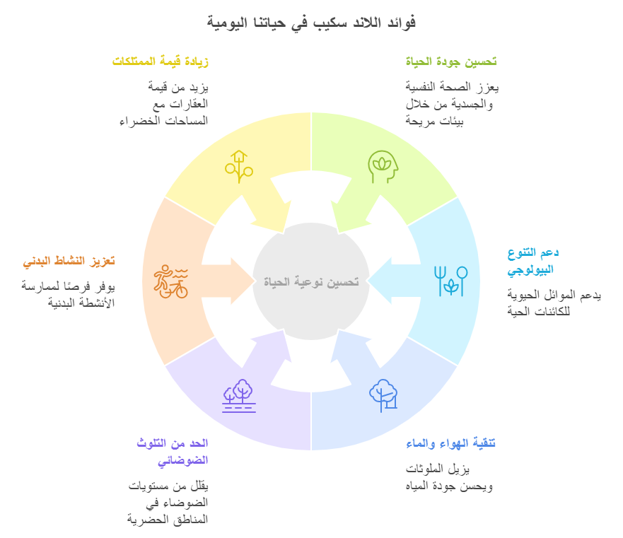 يعتبر اللاند سكيب عنصرًا أساسيًا في تحسين جودة الحياة، حيث يسهم في زيادة قيمة العقارات، وتحسين الصحة النفسية من خلال توفير مساحات للاسترخاء، وتعزيز الروابط الاجتماعية. كما تلعب المساحات الخضراء دورًا حيويًا في مكافحة التلوث ودعم التنوع البيولوجي.
